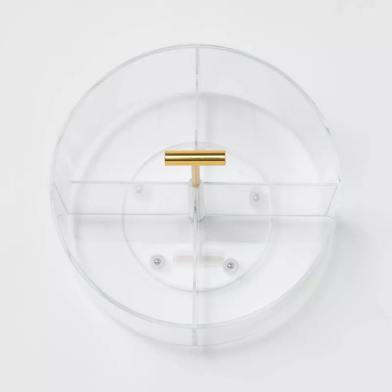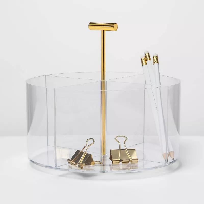 Organize your workspace with this Acrylic Round Desktop Organizer from Threshold™. This acrylic desktop organizer has an easy see-through design, making it easy to find the contents while lending modern charm. Designed with four compartments, this round desktop organizer offers enough space for writing utensils and other office supplies.