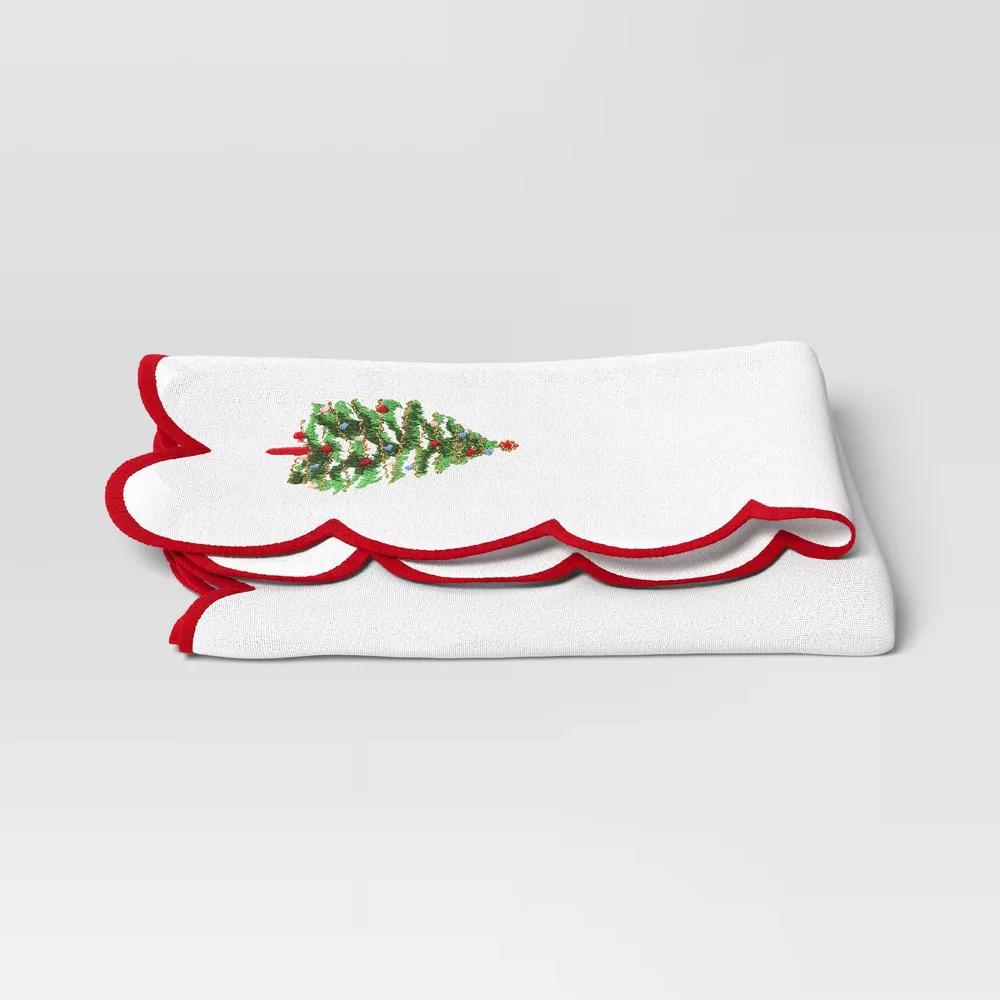 Create a gorgeous table setting for holiday dining with the Trim Tree Cloth Napkin from Threshold™. This ivory cloth napkin features Christmas trees decorated with ornaments and contrasting red trim for seasonal fun. Made of 100% cotton, this cloth napkin feels soft as you wipe your hands or dishes. Plus, it is machine washable for easy cleanup after use.