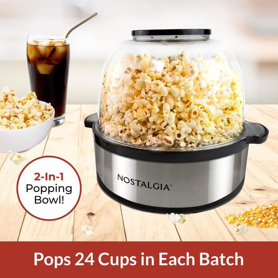 Make classic, tasty popcorn just like the movie theatre with the Nostalgia Classic Retro Stirring Electric Popcorn Maker! This popcorn machine is fun and easy to use. Simply add oil and kernels, wait for the sound of popping, and flip when the popping stops. Serving bowl, measuring cup, and oil spoon are included. Make up to 24 cups of hot, healthy popcorn for you to enjoy with your friends, family, or whoever else loves popcorn.
