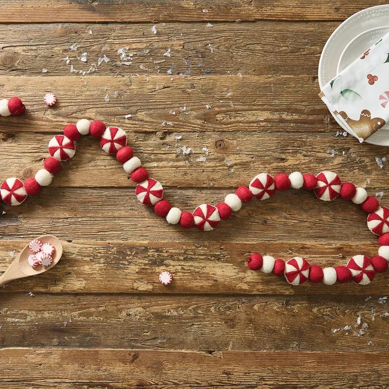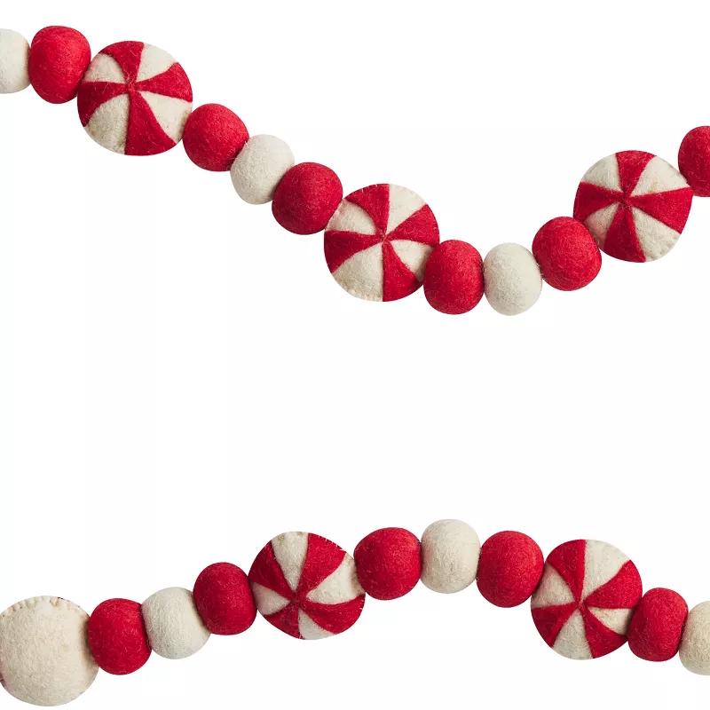 Whether draped along your Christmas tree branches, hung gracefully on your fireplace mantel, displayed along a wall, or used as a centerpiece on your holiday table setting, this red and white wool garland adds a touch of traditional elegance and timeless charm. The rich red and white colors evoke feelings of joy and celebration, making it the perfect complement to your seasonal holiday decor. This festive garland includes felt spheres in alternating colors with peppermints joined together on a durable string, including loops at both ends for quick display.