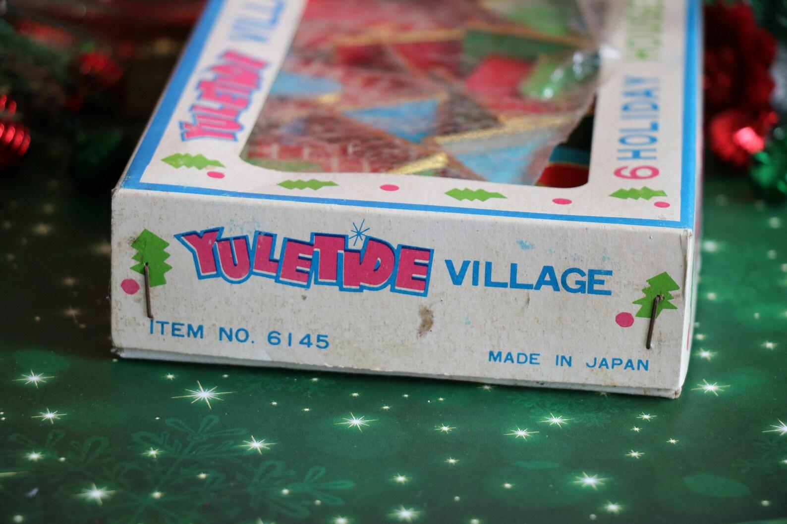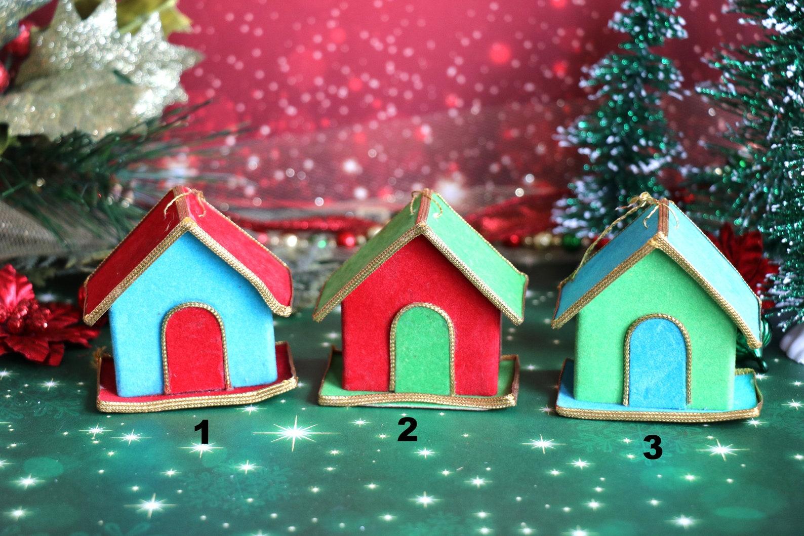 This is a brightly colored felt covered little house ornament. They were imported from Japan & sold in the US in the 1950's-1960's by a company named Yuletide. The last picture shows how they were packaged. Everything about these are so mid-century good. This have faired very well over the last 60-70 years & are in good condition. Since the house frame is cardboard, some of the porches, as with any cardboard putz house, might have a small curve in the base. This is shown in the pictures. There is a string at the top for hanging. Each house base measures 2-1/4 x 1-1/2 inches & the house is two inches tall. You will receive 1 fun & delightful felt house.
