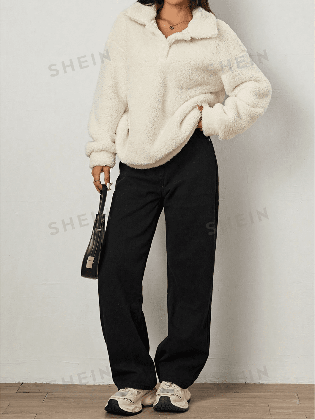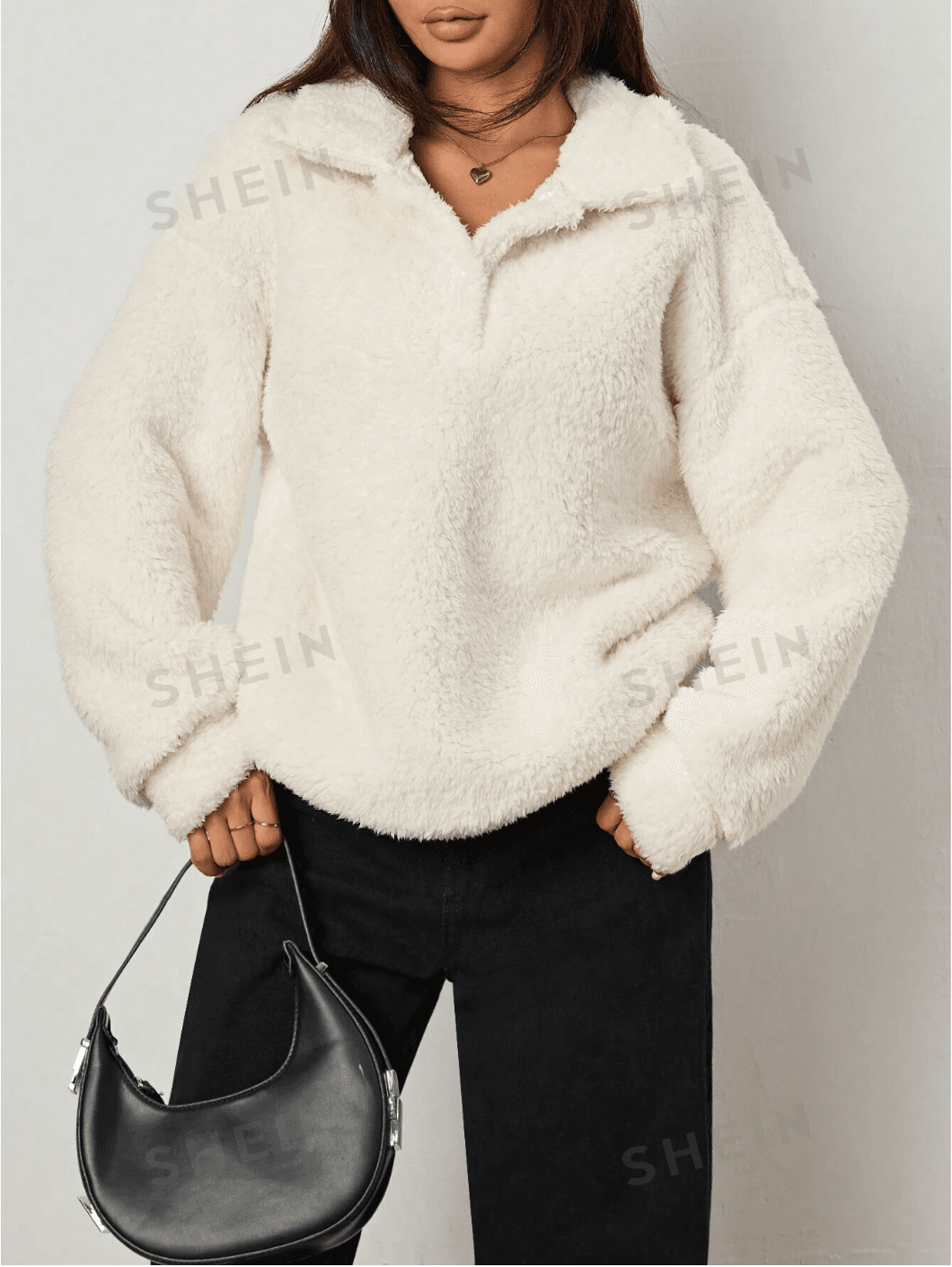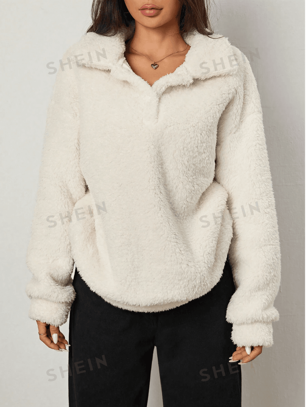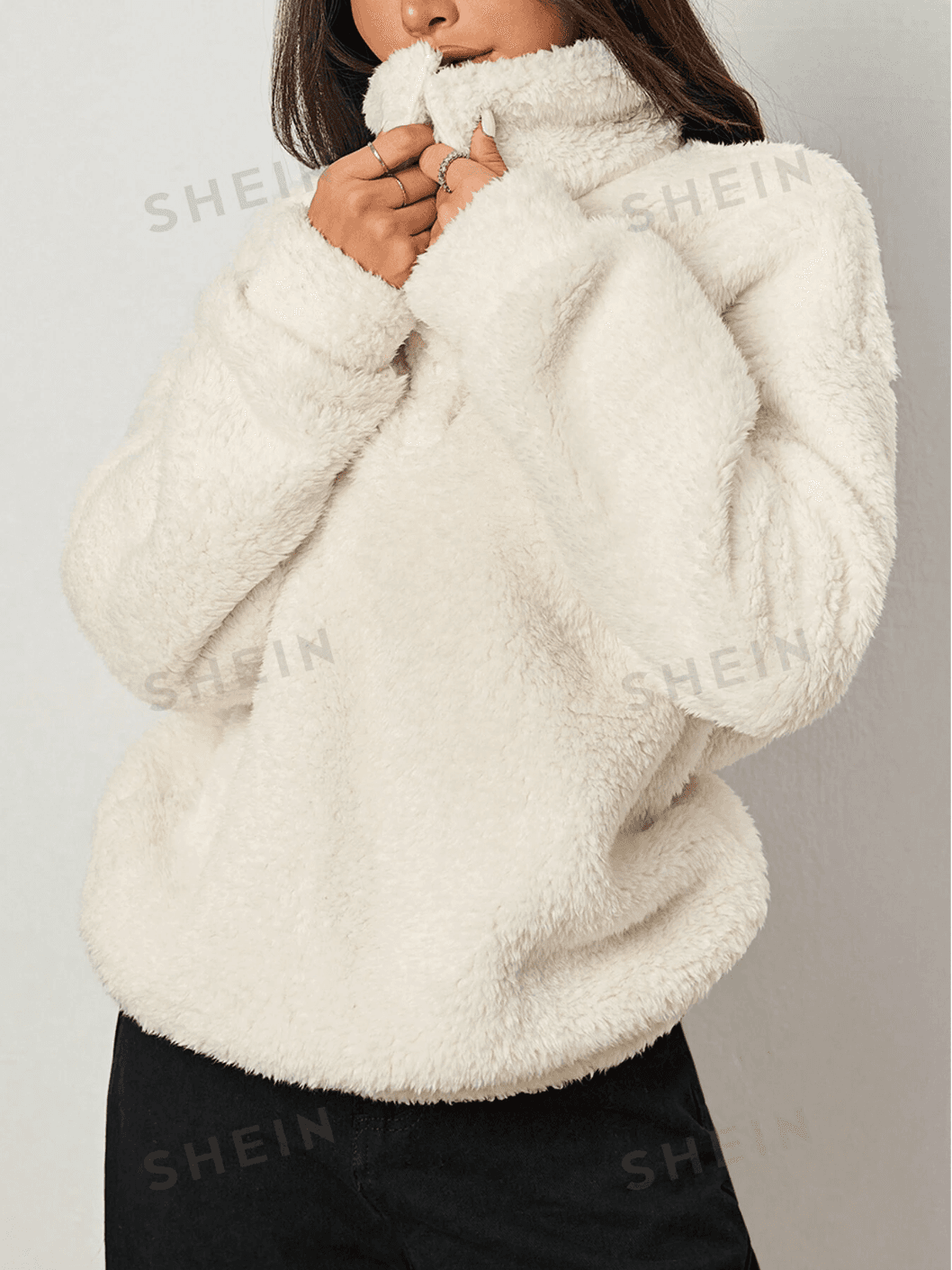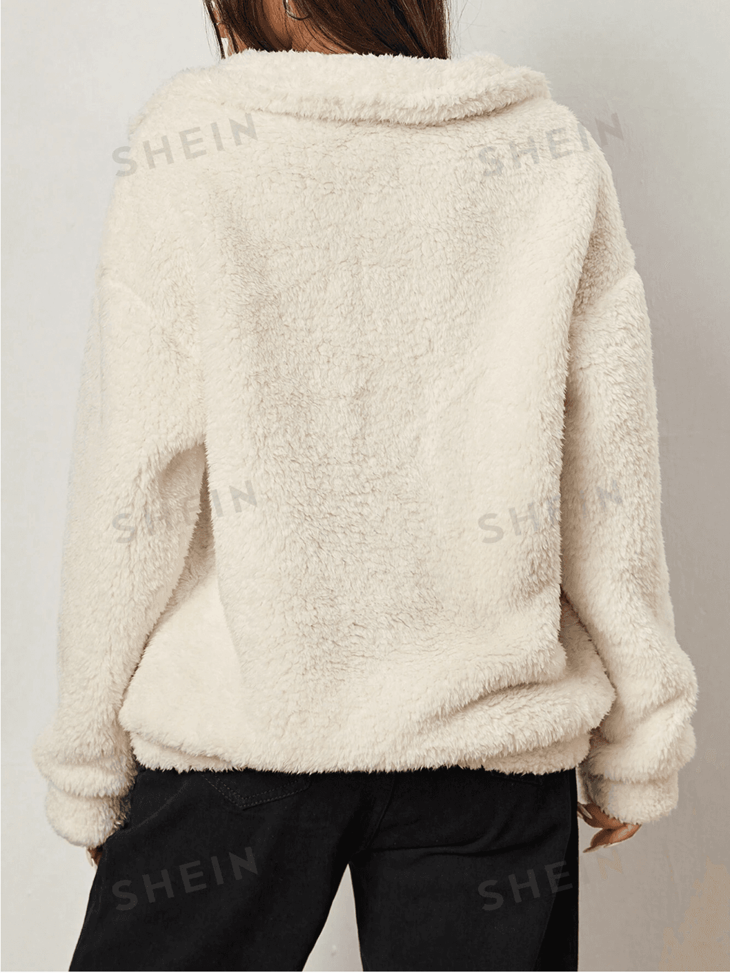 .Details: Zipper. Neckline: Collar. Sleeve Type: Drop Shoulder. Style: Casual. Type: Half Placket. Hem Shaped: Regular. Color: Beige. Pattern Type: Plain. Sleeve Length: Long Sleeve. Length: Long. Fit Type: Oversized. Fabric: Slight Stretch. Material: Knitted Fabric. Composition: 100% Polyester. Care Instructions: Machine wash, do not dry clean. Temperature: Winter (<10℃/50℉). Sheer: No.