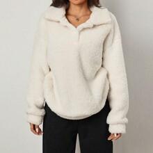 White Fleece Fabric Half Placket Button Closure Fashionable Plain Color Long Sleeve Women Sweatshirt