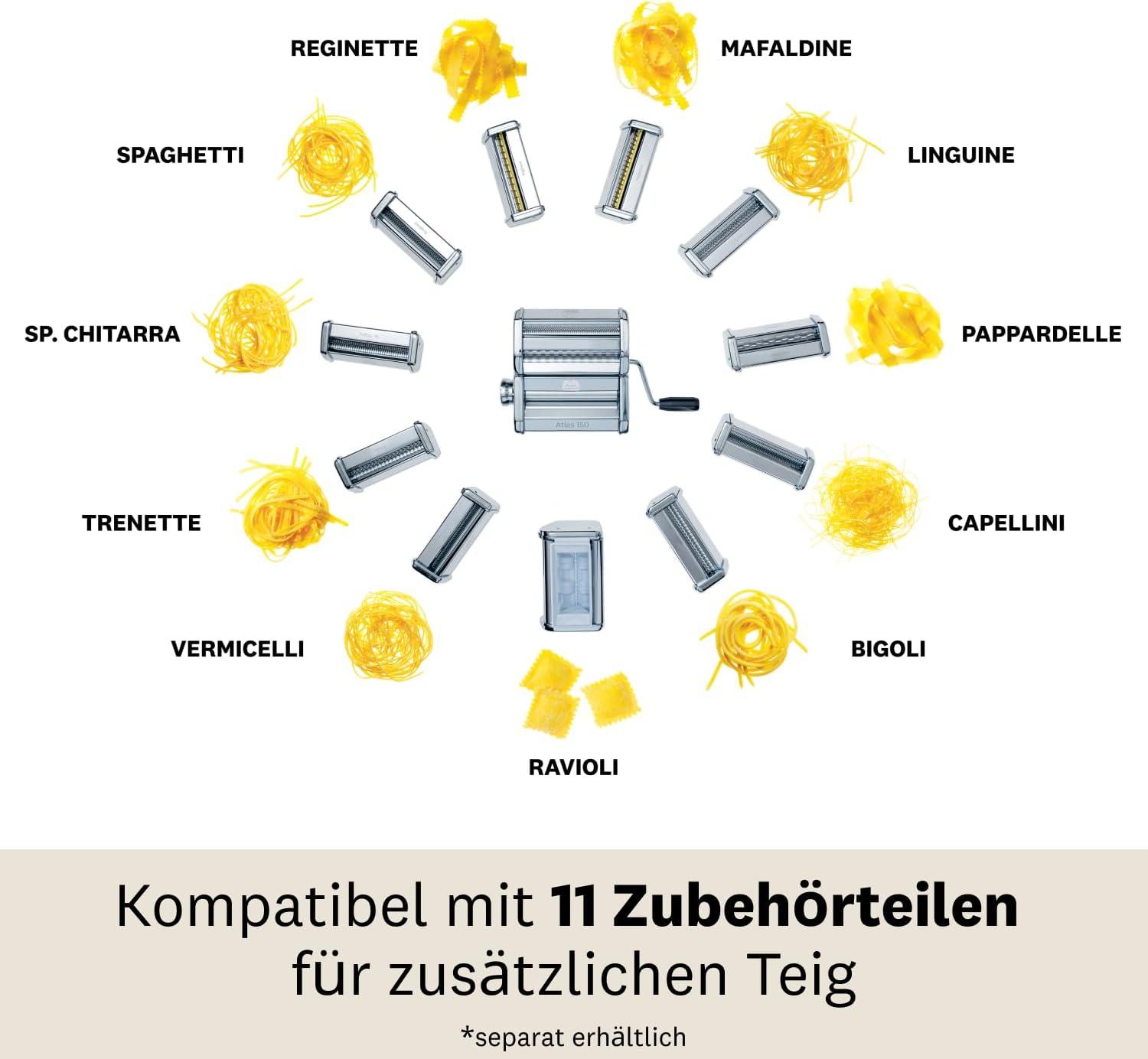 Marcato’s Original World-Famous Atlas 150 pasta machine rolls and cuts pasta dough for traditional lasagna, fettuccine, and tag at home. Made in Italy from chrome-plated steel; Includes pasta machine, pasta cutter, hand crank, clamp, Instructions; 10-year Rolls sheets of dough to 150-millimeters wide at 10 thicknesses (0. 6 to 4. 8-Millimeter) for consistent texture, cook time, and taste.Atlas 150 is not dishwasher safe. Easily attach the pasta drive motor and any of the 12 pasta cutting accessories (sold separately). Material Type: Nickel-Plated Steel, Chrome-Plated Steel, ABS.