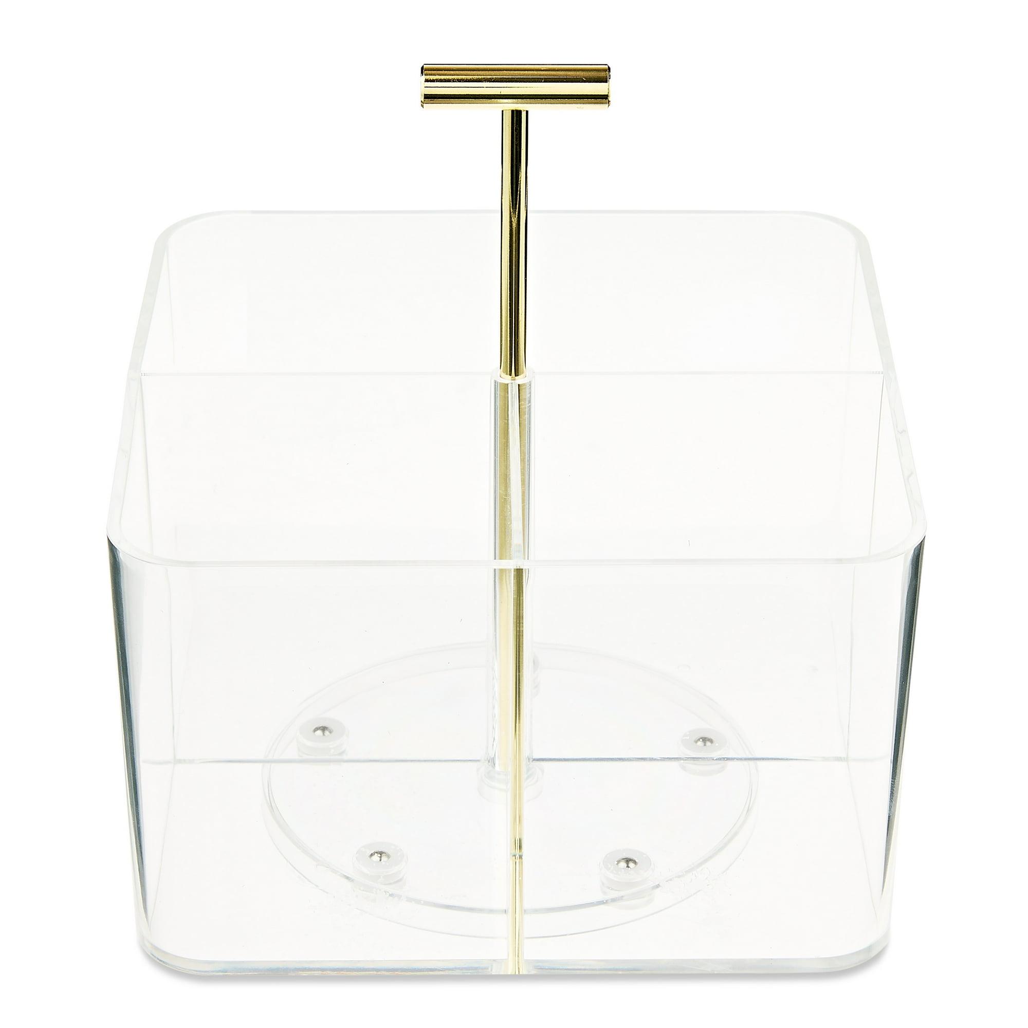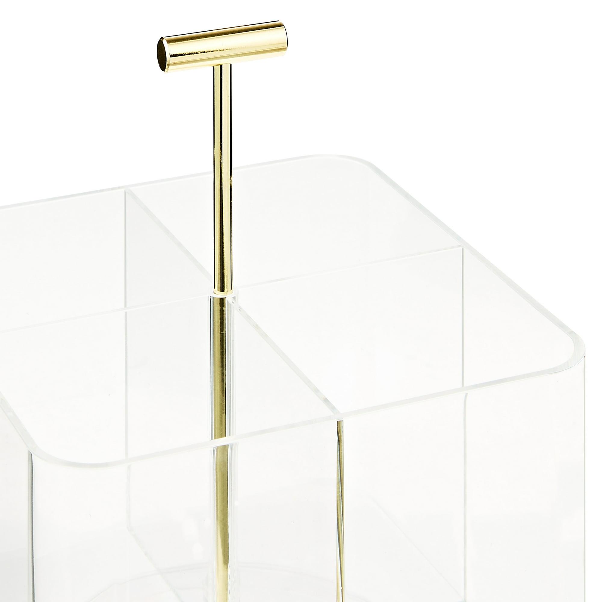 Pen+Gear Acrylic Rotating Desk Organizer, 6.57 in x 6.57 in x 7.28 in, 4 Compartments, Clear. Makes it easy to keep your desk clutter free. 360-degree rotating. Use it to hold your writing utensils, paper clips, binder clips, or scissors. Clear design makes it easy to see what you have. Gold accents add sophistication and elegance. Pair with other Pen+Gear products.