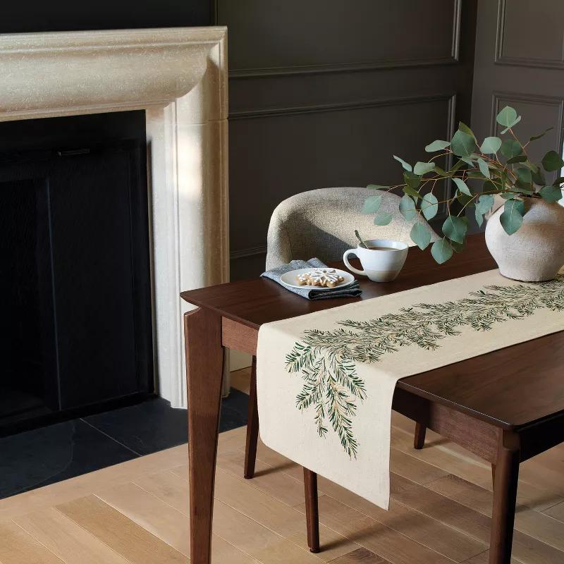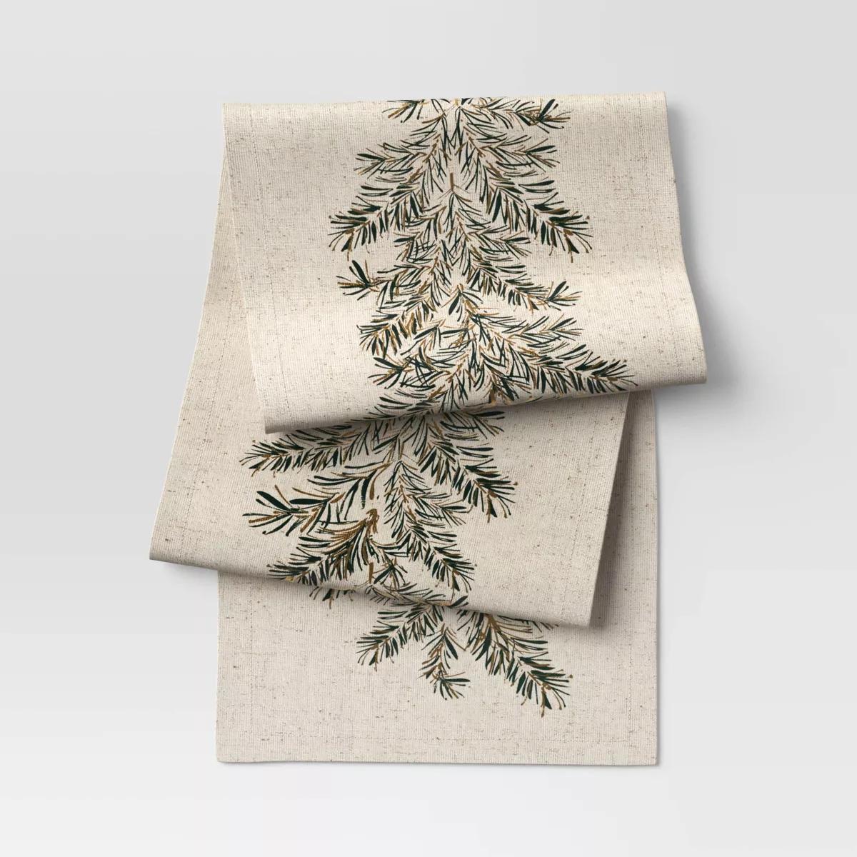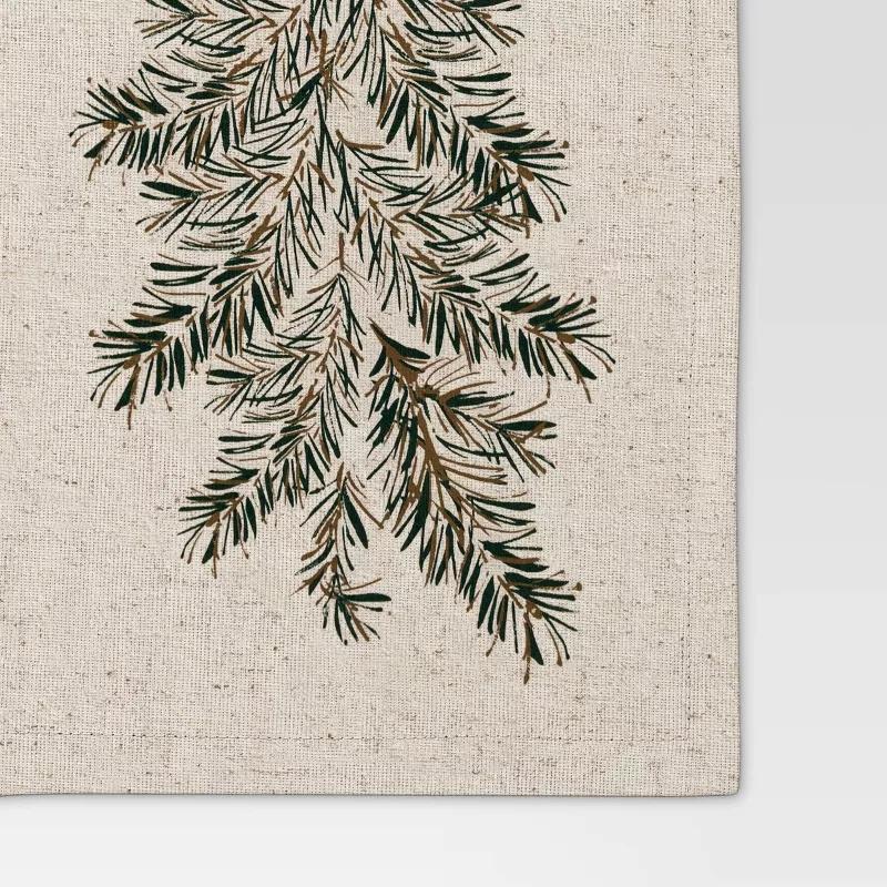 Fill your dining room decor with cozy wintry flair with this Branches Table Runner from Threshold™. Designed in an ivory hue, it features an allover print of green branches for a cheerful look. Made from cotton-linen blend fabric, you can simply toss it in the washing machine for a quick refresh whenever needed.