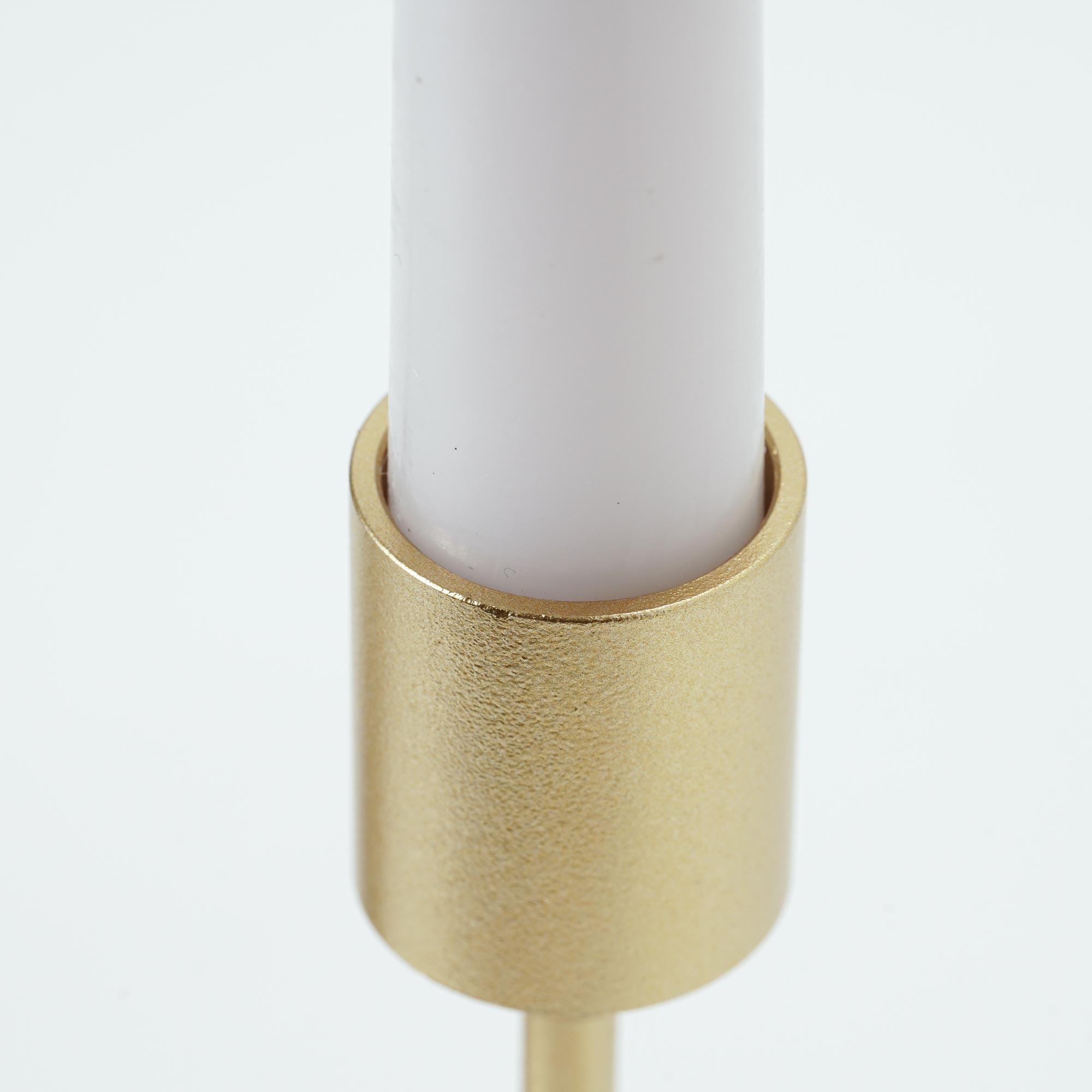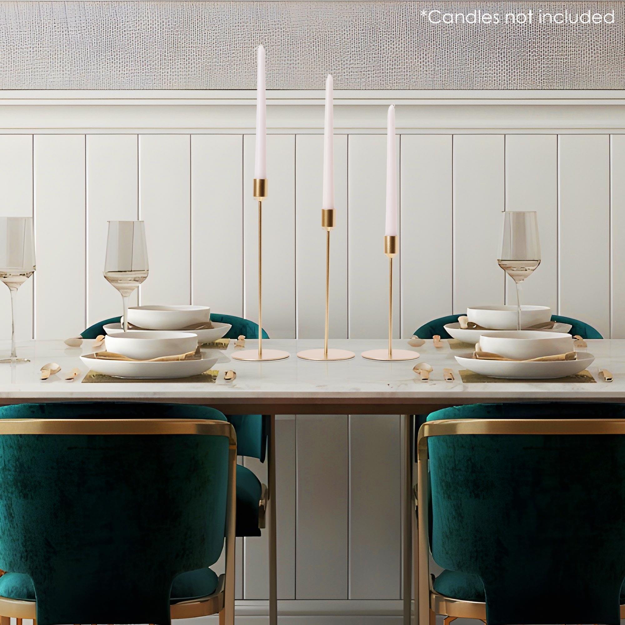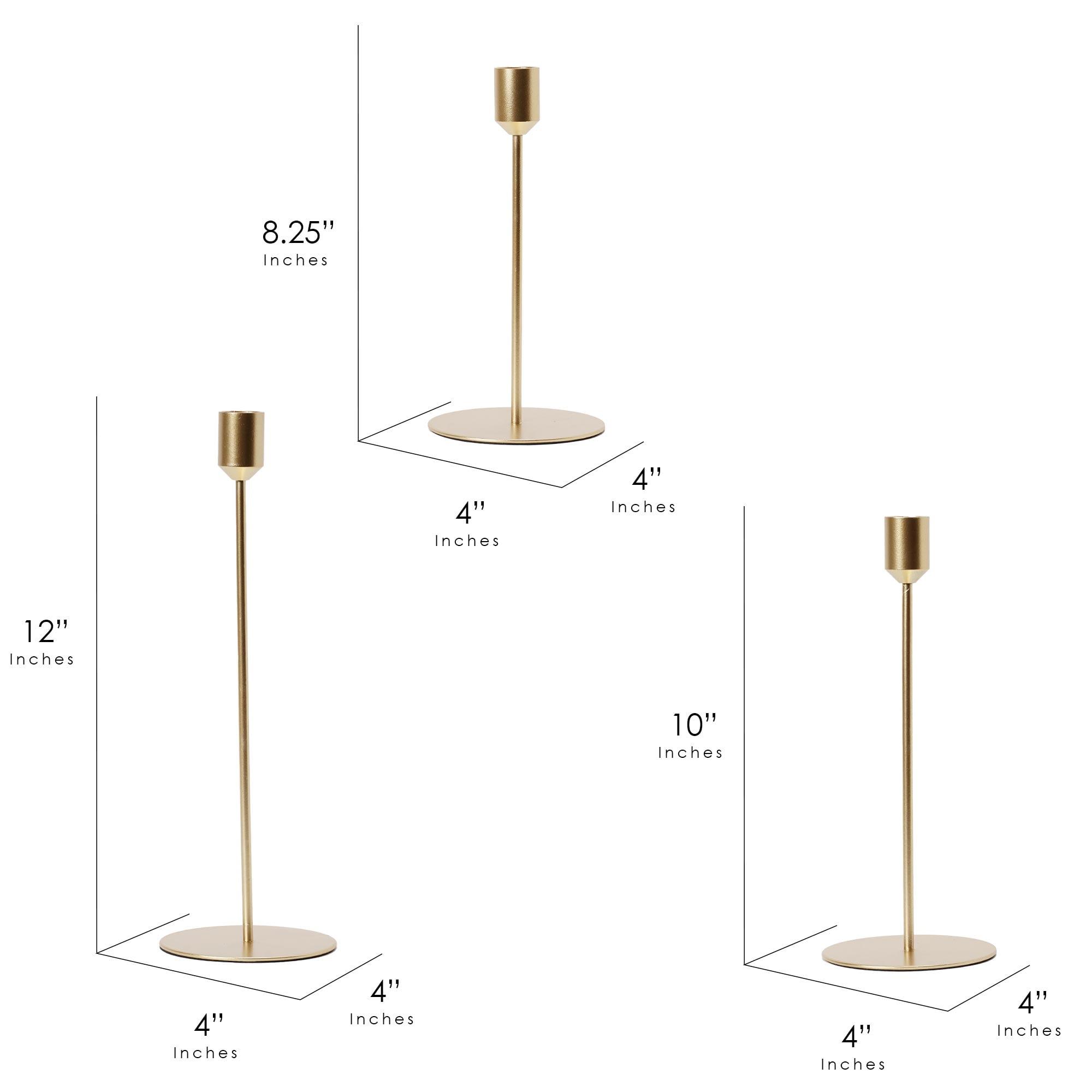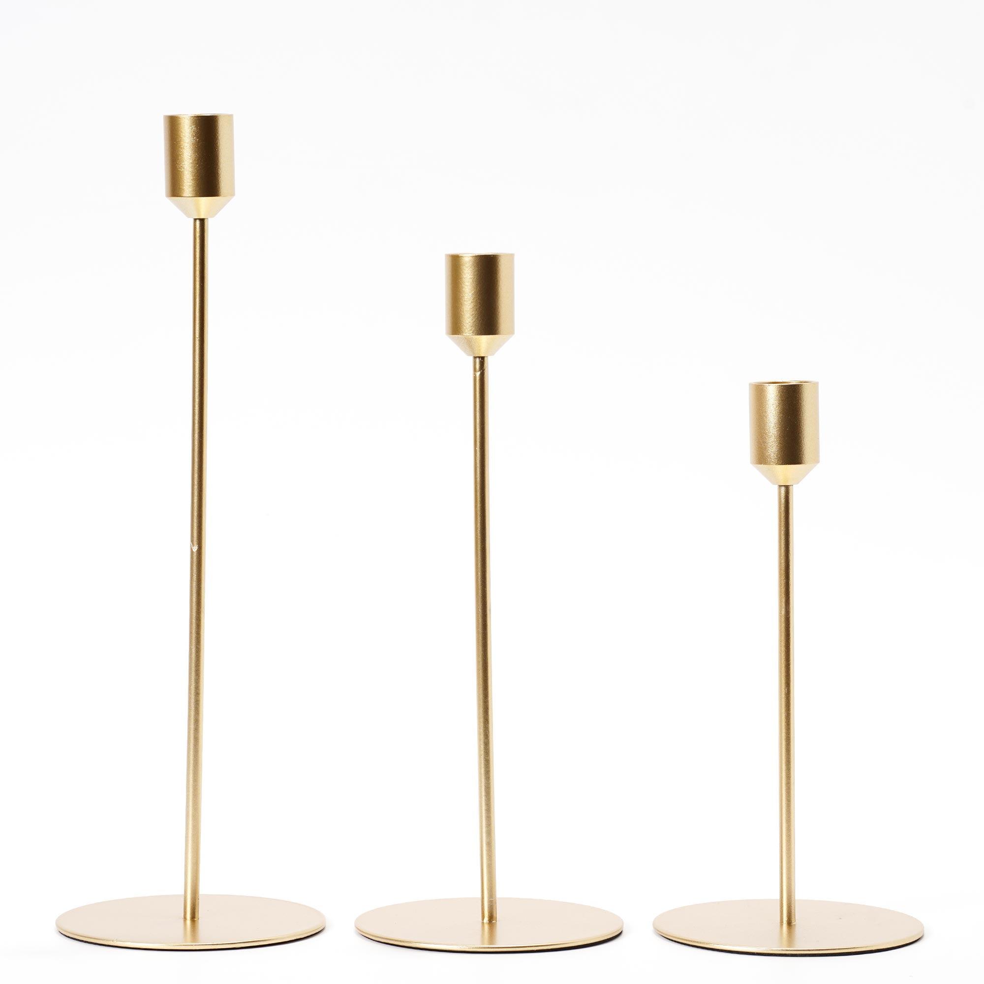 3 PIECE CANDLE HOLDER SET - For better lighting in one room, three candles are better than one. You also have the option to split the set for use in multiple spaces. VERSATILE APPLICATION - Shed some natural light in your kitchen, living room, or dining room with our 3-tier taper candle holder set in a classic brushed gold hue. CLASSIC DESIGN - Tall, sleek, and slim is the classic taper candle design. This golden trio comes in three heights for a dramatic presentation.