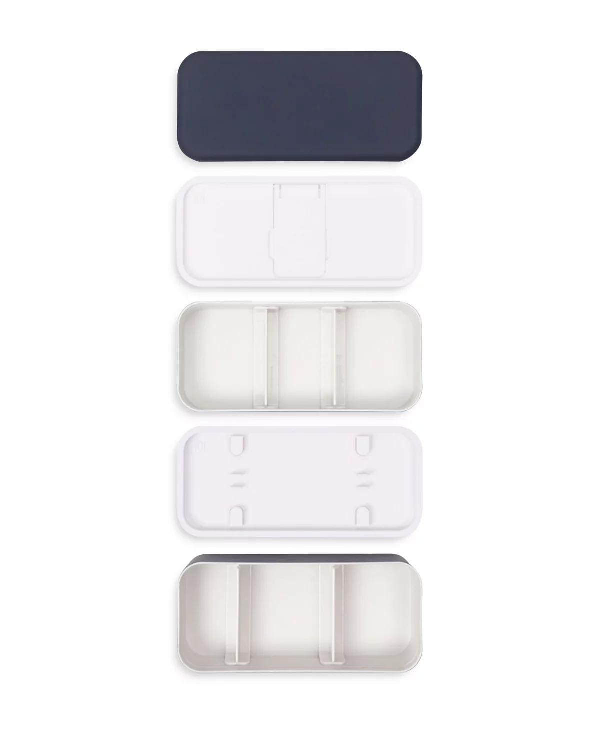 Dimensions 7.4"L x 3.4"W x 3.4"H. Set includes: four storage compartments, two storage lids, two storage straps. Storage compartments feature adjustable dividers for power bricks chargers and cables. One storage lid holds two Apple Watchbands and an Apple Pencil or Stylus. Second storage lid features a built-in SmartPhone stand (iPhone 8 and later). One large premium silicone strap keeps everything secure when mobile. Second smaller premium silicone strap is included for securing just one compartment. 1-year warranty. Imported.