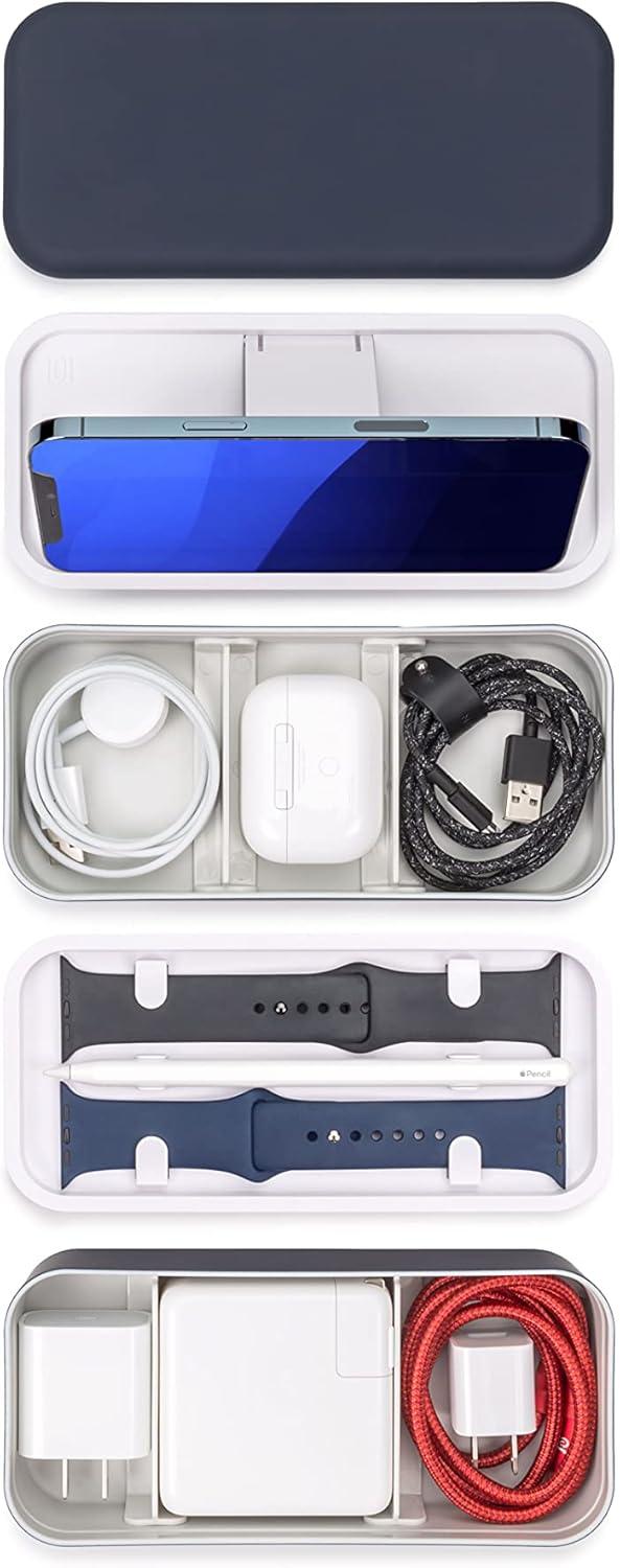 The most versatile everyday carry (EDC) Tech Organizer on the market, BentoStack Apple Accessory Organizer is the perfect solution over cable organizer bags as it is designed specifically to hold Apple accessories for travel and desktop organization. STACKABLE DESIGN – The bottom storage compartment houses larger accessories like MacBook Pro, iPad, and iPhone Power Adaptors. An upper storage compartment provides storage for smaller accessories such as iPhone charging cables, Apple Watch charging cables, headphones, and AirPods. Each compartment has its own lid. The Bottom Lid stores two extra Apple Watchbands and the Apple Pencil while the Top Lid has an iPhone stand for portrait or landscape viewing! TRAVEL READY – Ultra-compact design allows storage for up to 10 different Apple accessories that easily fit into travel bags and backpacks. DESKTOP ORGANIZATION and CABLE ORGANIZER - Eliminate clutter on the workspace by keeping Apple essentials neat, organized, and easily within reach. Your cables are always where you need them. MODULAR & CUSTOMIZABLE - Personalize the way you organize Apple accessories. Take the full BentoStack with you or just one section with the smaller silicone strap for lighter travel. Four adjustable dividers allow the user to create custom storage space inside each compartment to secure each accessory. Measures 7.5 inches x 3.25 inches x 3.5 inches.