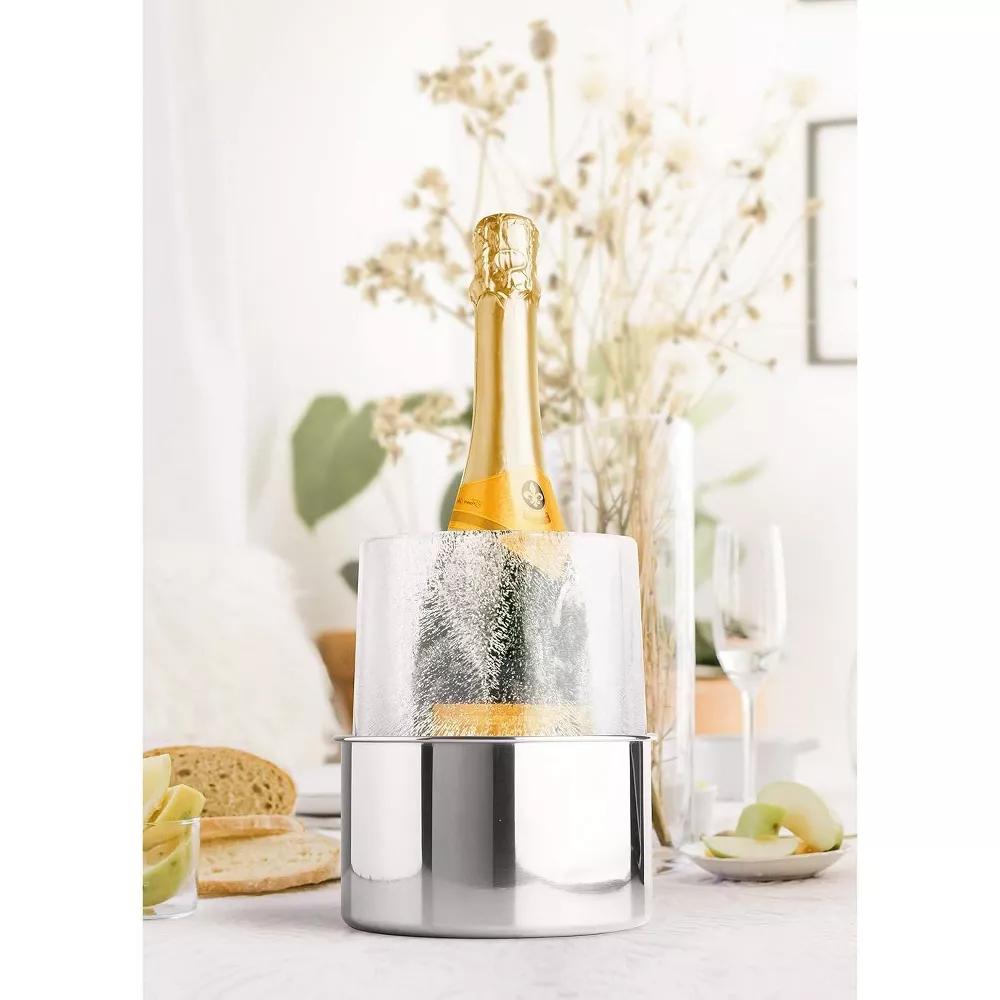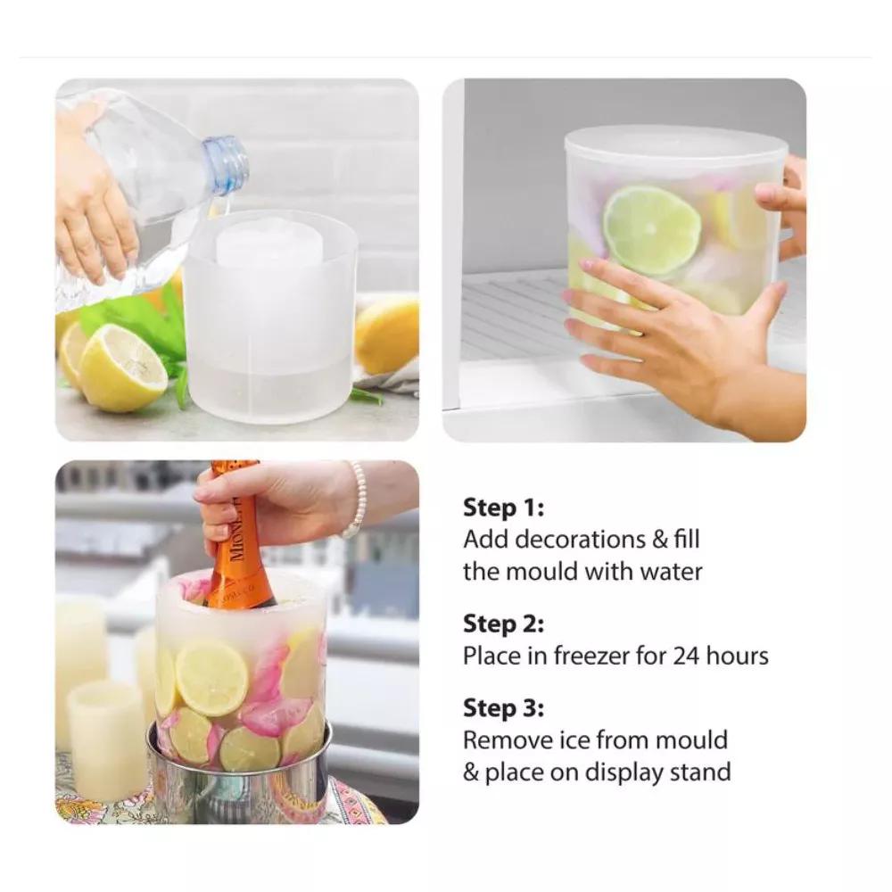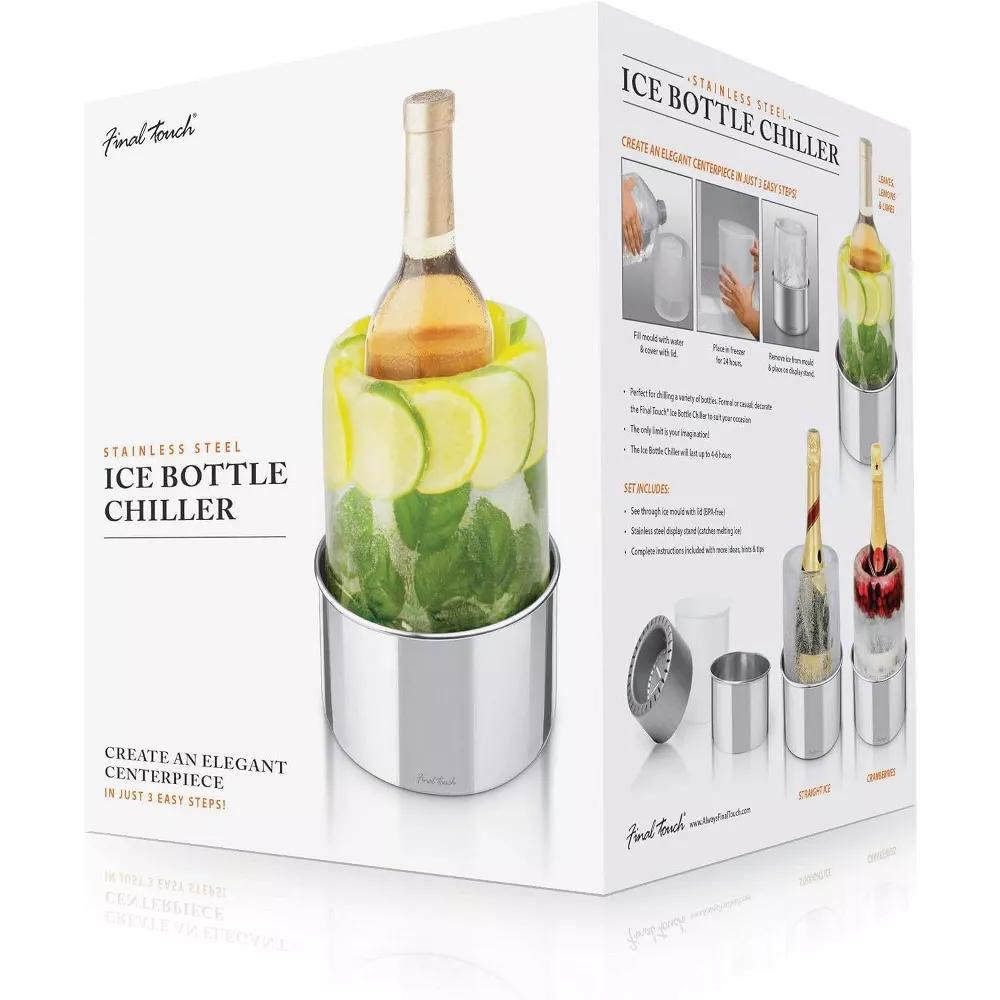 The Final Touch Ice Bottle Chiller is the perfect addition to your special events. Perfect for chilling bottles and great as a romantic candle holder. Simple to use, just add water and create a conversation piece, or if you feel creative, add your decoration of choice for a stunning one of a kind centerpiece. Dress it up by adding fruits, ornaments, flowers, food colouring, or anything else; the possibilities are endless. Perfect for chilling a variety of bottles. Formal or casual; decorate the Final Touch Ice Bottle Chiller to suit your occasion The only limit is your imagination! The Ice Bottle Chiller will last up to 4-6 hours Set Includes: See through ice mould with lid (BPA-free) Stainless steel display stand (catches melting ice) Complete instructions included with more ideas, hints & tips Step 1: Fill mould with water & cover with lid. Step 2: Place in freezer for 24 hours. Step 3: Remove ice from mould & place on display stand.