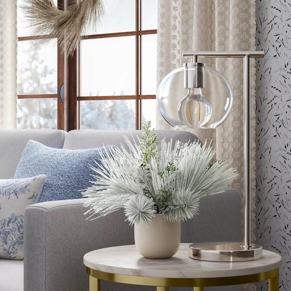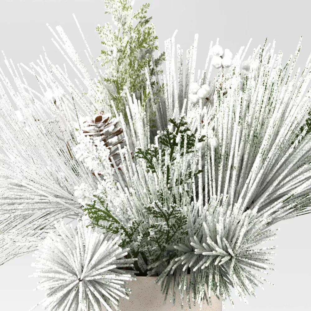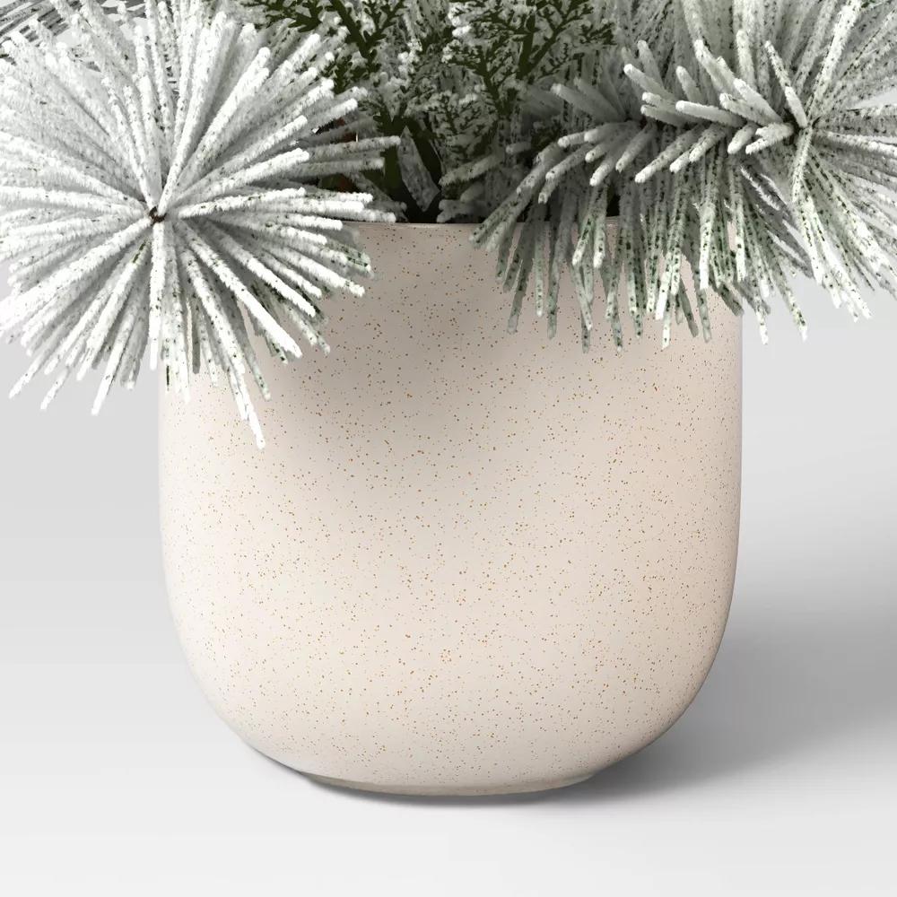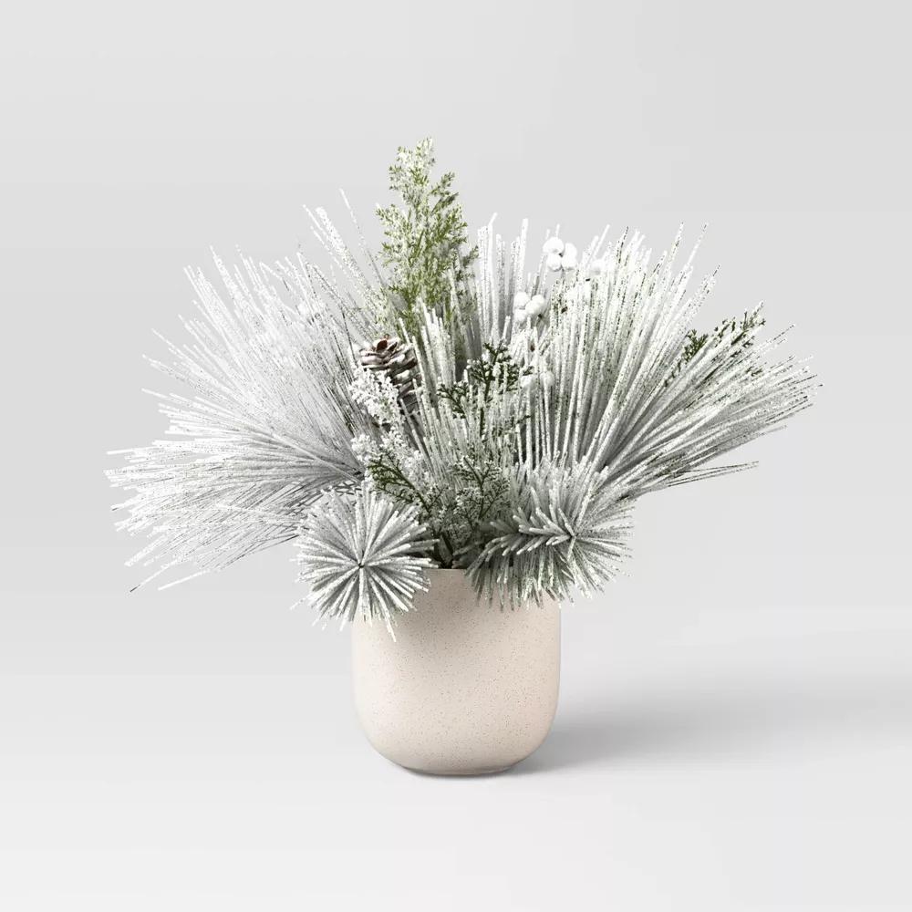 Add a touch of winter charm to your Christmas setup with this Small Heavy Flocked Artificial Plant Arrangement from Threshold™. This small plant arrangement features faux flocked pine and cypress plants. Plus, it includes a white ceramic container with moss filler that creates a realistic effect. Place it on a tabletop, mantel or coffee table for an elegant, festive look.
