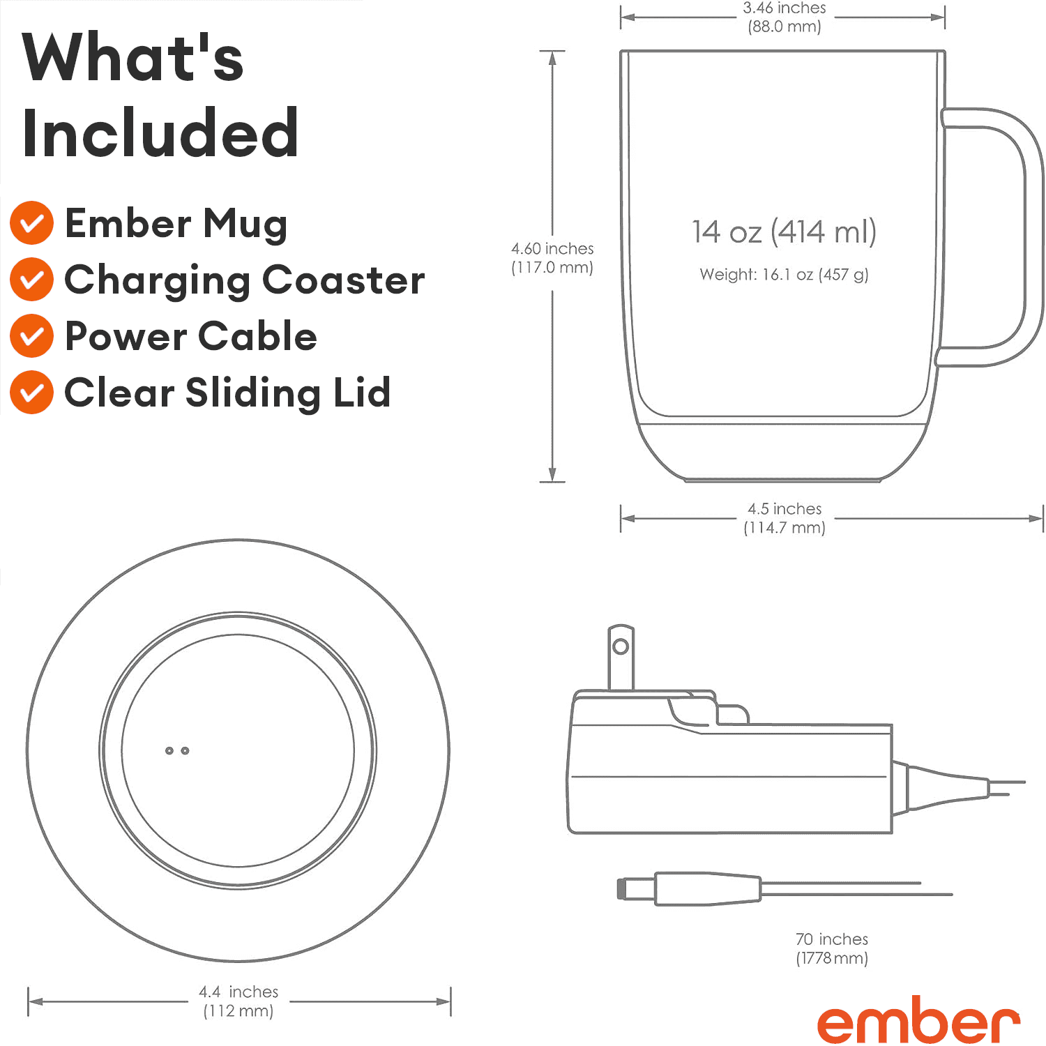 Capacity: 14 fl oz. Built-in battery to maintain your drinking temperature. Battery life: 80 minutes, or all day on included charging coaster Ember Mug Charging Coaster 2 included. Pairs with the Ember app. iOS and Android compatible. Temperature range: 120°F – 145°F. Ember Mug is safe to hand wash and submersible up to 1 meter in water. Do not microwave.